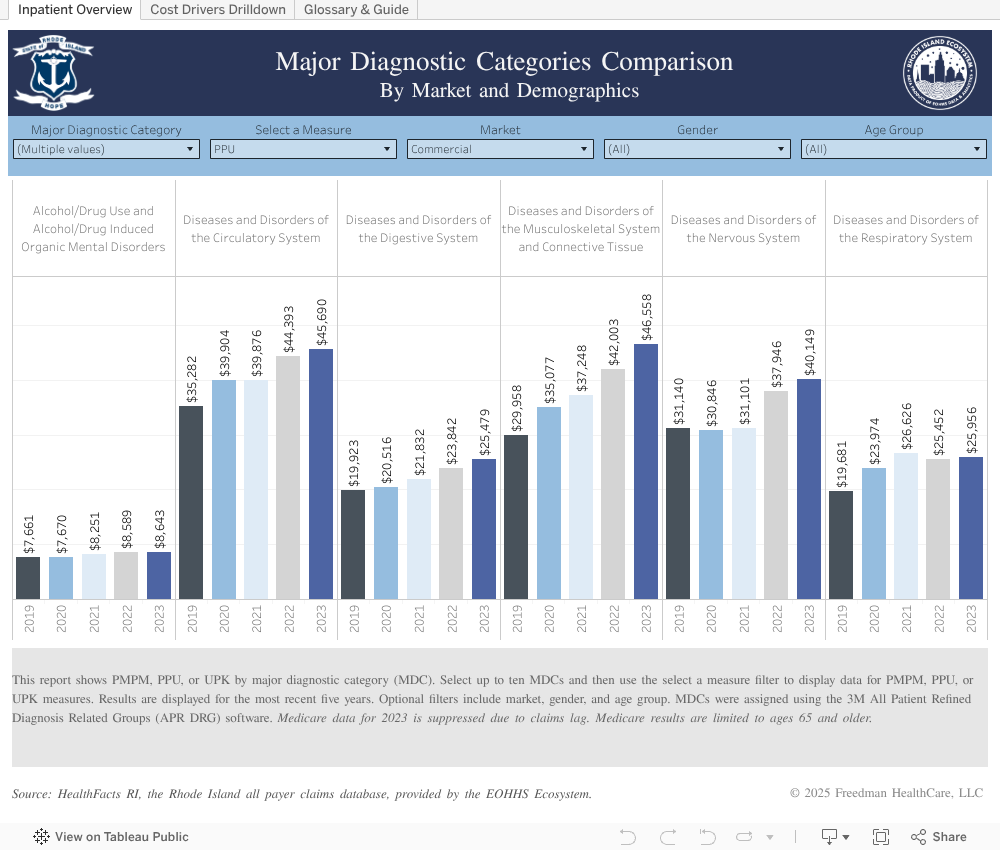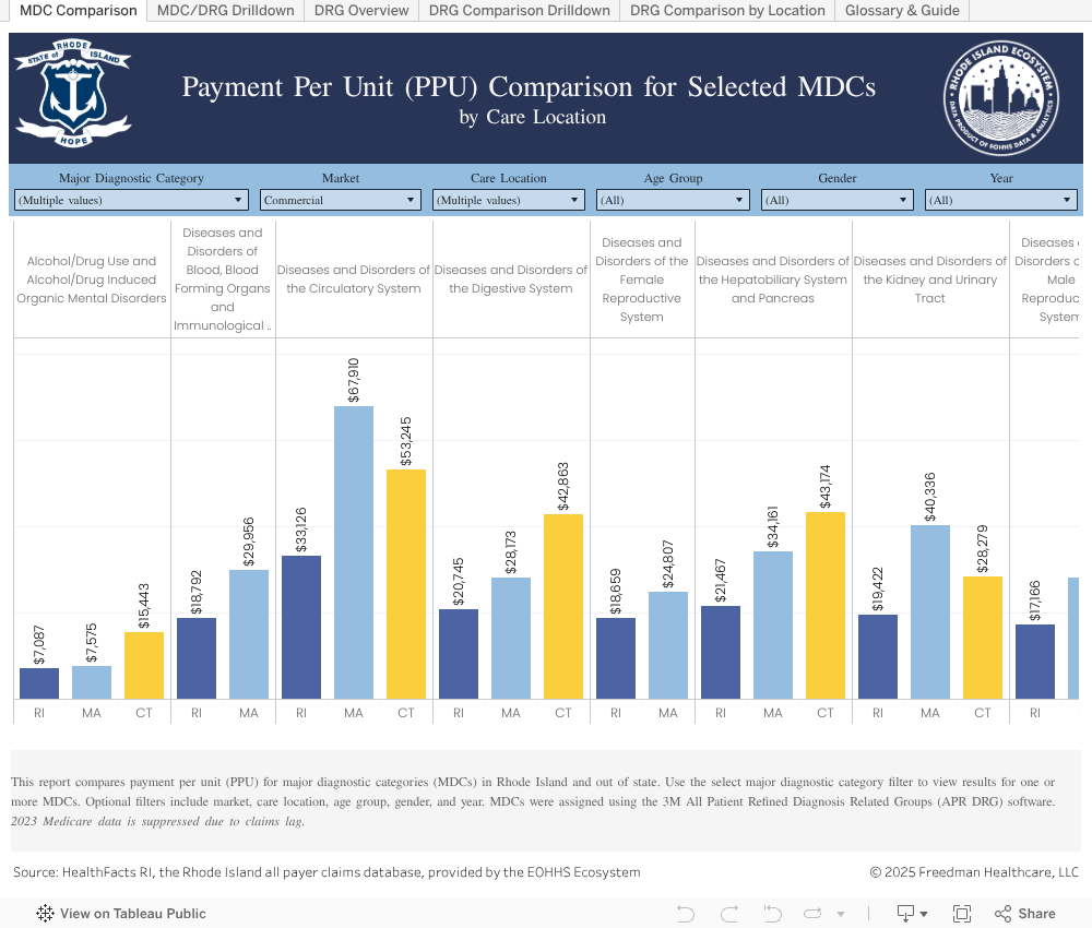 This dashboard compares in-state and out of state spending for hospital-provided services for which Rhode Island residents traveled out of state. Results are based on Major Diagnostic Categories (MDCs) and Diagnosis Related Groups (DRGs). MDCs organize illnesses into 25 mutually exclusive groups based on principal diagnoses and by medical specialty and organ system or etiology. To help facilitate meaningful comparisons, DRGs are assigned and used to categorize hospital inpatient visits based on severity of illness, risk of mortality, medical prognosis, need for intervention, and intensity of resource use in treating patients. Each DRG falls within a Major Diagnostic Category (MDC). Out-of-state care locations include Massachusetts, Connecticut, and All Other states.