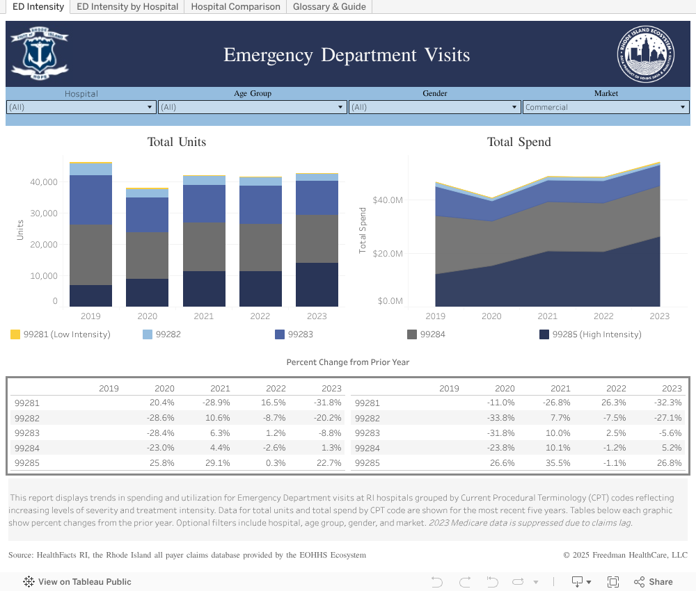 This report allows users to compare spending and utilization for Emergency Department (ED) visits by named Rhode Island hospital. ED visits are grouped using Current Procedural Terminology (CPT) codes reflecting increasing levels of presenting problem severity and treatment intensity. CPT code 99281 is assigned to ED visits for low severity presenting problems that can be addressed using relatively simple medical interventions. Codes 99282 through 99285 are used for more serious ED visits and require a medically appropriate health history and exam. These codes capture increasing intensity of needed medical intervention based on the number and complexity of presenting problems and risk of complications, morbidity, or mortality. CPT codes 99284 and 99285 are applied to the most complex ED visits requiring the highest levels of medical decision making and number and intensity of services to address.