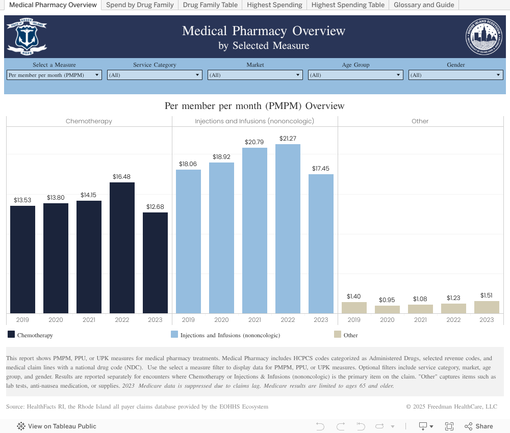This dashboard supports analysis of utilization and spending on Chemotherapy drugs for Rhode Island residents by care location in Rhode Island, Massachusetts, and Connecticut. Users can compare total spending, units, payment per unit, and identify the Chemotherapy drugs that account for the largest share of total spend. Chemotherapy treatments typically occur in an outpatient facility or professional office setting and are defined by “J Codes.” Results are based on analysis of claims data for commercial insurance plans, Medicaid, and Medicare.