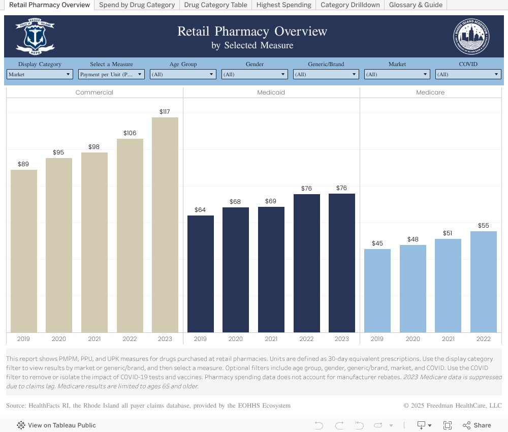 This dashboard summarizes health care utilization and spending measures and the number of covered lives by payer type in Rhode Island. This information supports analysis and understanding of health care cost drivers to generate insights into policy options for slowing spending growth within the state. Pharmacy spending data does not account for manufacturer rebates.